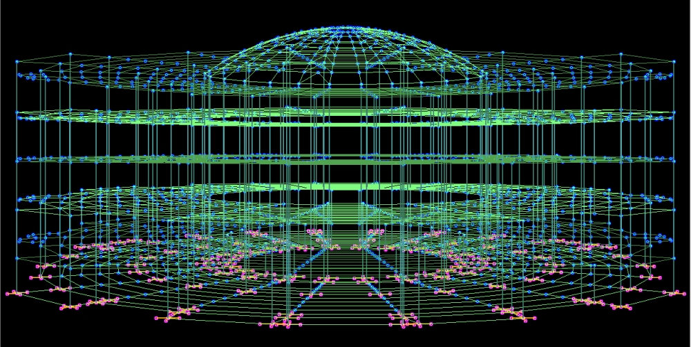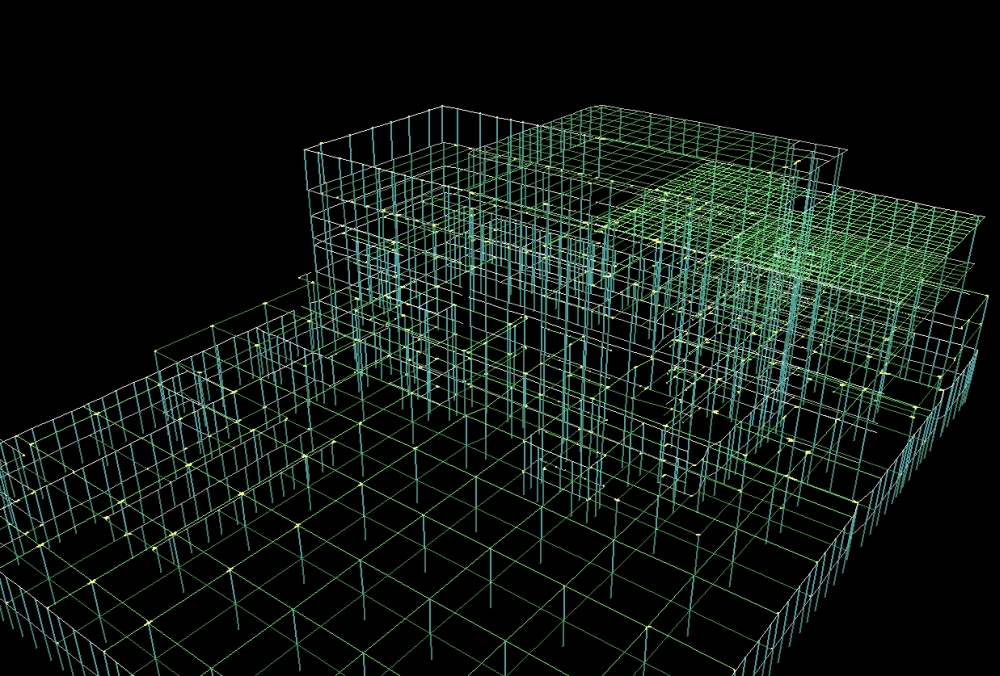 The above is a screen capture of the “3DV” module, designed and written entirely by me. It is from the early black-background days, before we were told to switch to white background to “make it look more like Microsoft Word”. 3DV can pan the structure up, down, right and left, zoom it in and out, and rotate it in any way the user likes. Using data produced by the finite-element analysis module, it can also show the distortions that the building undergoes due to static loads, or in the event of an earthquake. It can even animate the distortion of the whole building. (Pretty fancy stuff!)