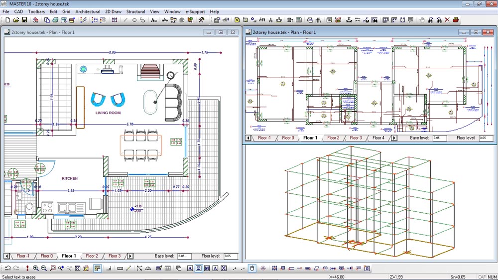 In the above screen capture 3DV is on the top-left panel, with perspective again switched off. Along each member it displays a torque diagram, using data obtained from the finite-element analysis module. On the right side two other modules display different kinds of 3D views of the building. Back in 1998 these modules had not been implemented yet.