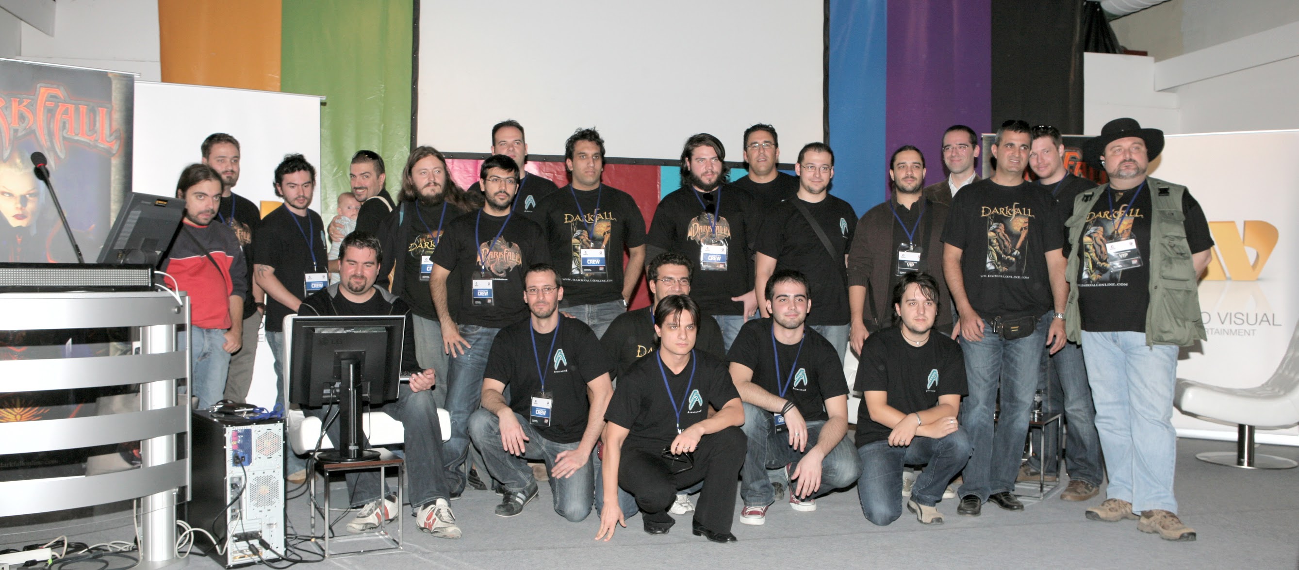 Finally, a picture of (almost) the entire Darkfall crew, taken in Athens on October of 2008, about 5 months before the game was released. I am the guy holding his very surprised baby son in his arms. (By that time I had started trimming my hair very short.) I think only about 4 people are missing from this photo, unfortunately two of them being the only two women in the crew at that time.