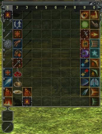 The following two pictures show the hotbar window. It is a matrix of 10 by 10 placeholders where you can put all your weapons and spells for quick access, and where your currently selected weapon and currently selected spell are displayed. There is a set of key bindings for selecting which one of the 10 columns will be visible, and another set of key bindings for activating one of the 10 items in the currently visible column. In the first picture we can also see a progress overlay which shows that a certain spell is recharging, giving us a visual indication of how long it will take before we can use it again. The second picture shows the fully unfolded view of the hotbar, which is primarily used for dragging and dropping items from other inventory windows and from the spells window.