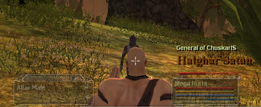 In the following picture I have my crosshairs on another player, and I can see their rank, the clan they belong to, their name, and their health. The target info window tells me that the other player is an Alfar Male, in case I had not noticed.