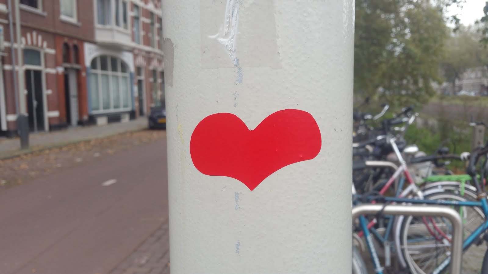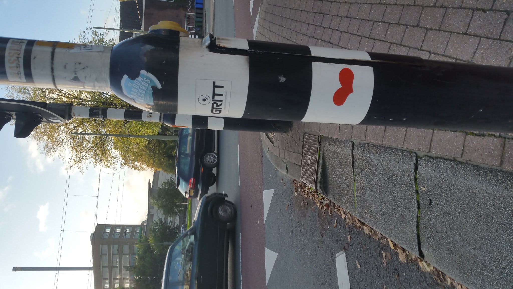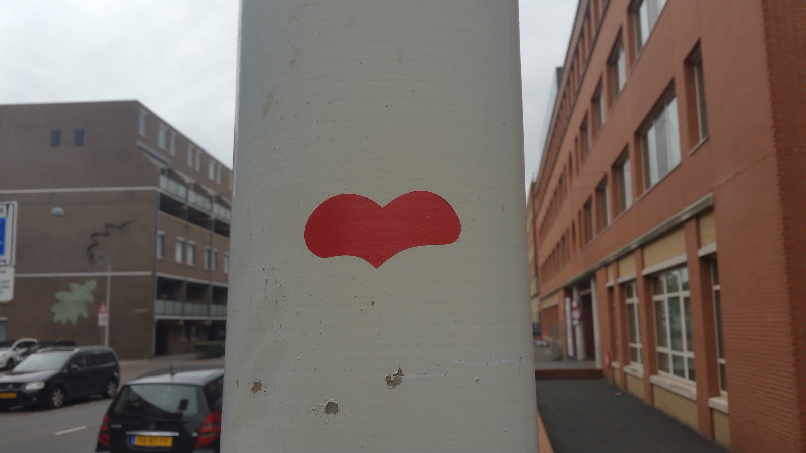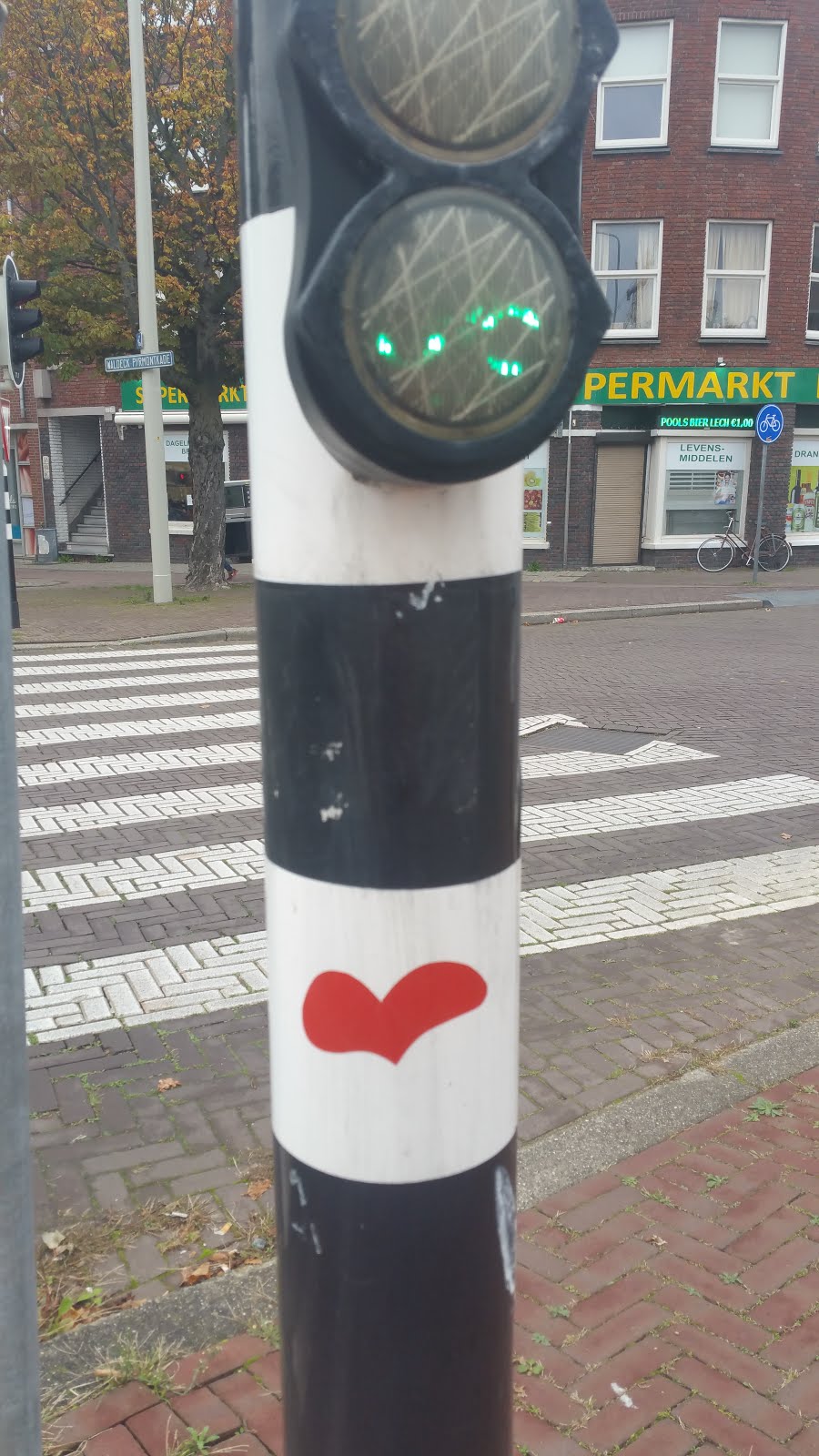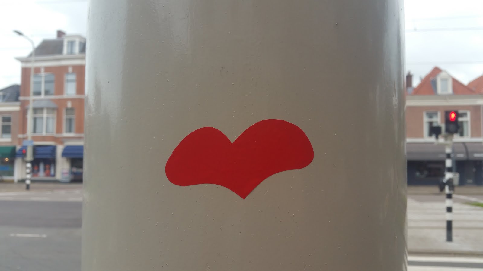So, after a bit of research it seems that the heart had been placed on the traffic light post back in 2015, and then in 2016 the post was probably hit by a car and became slightly slanted, so today there is no heart sticker on it anymore, but it is standing straight again, so it has probably been replaced.