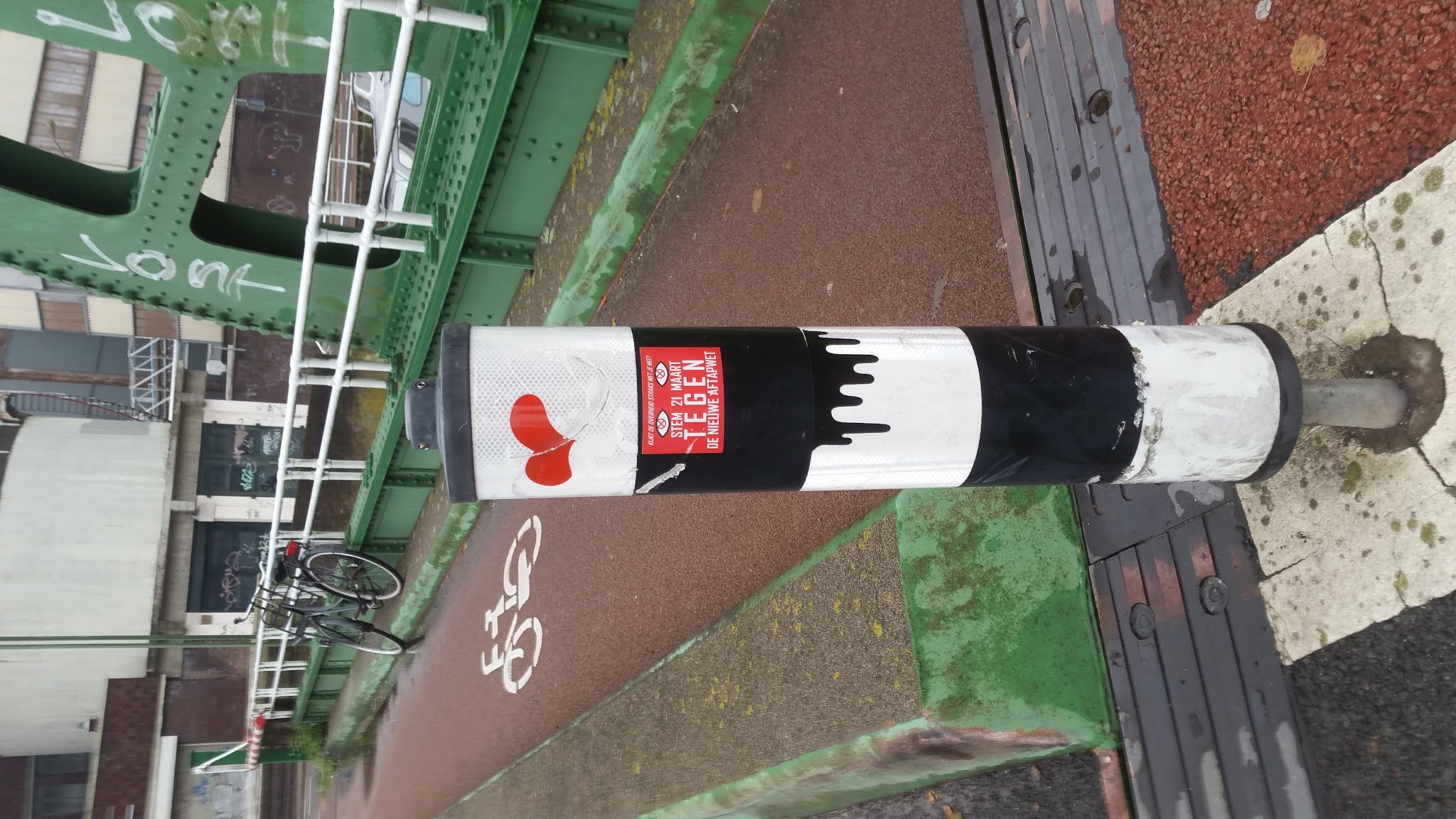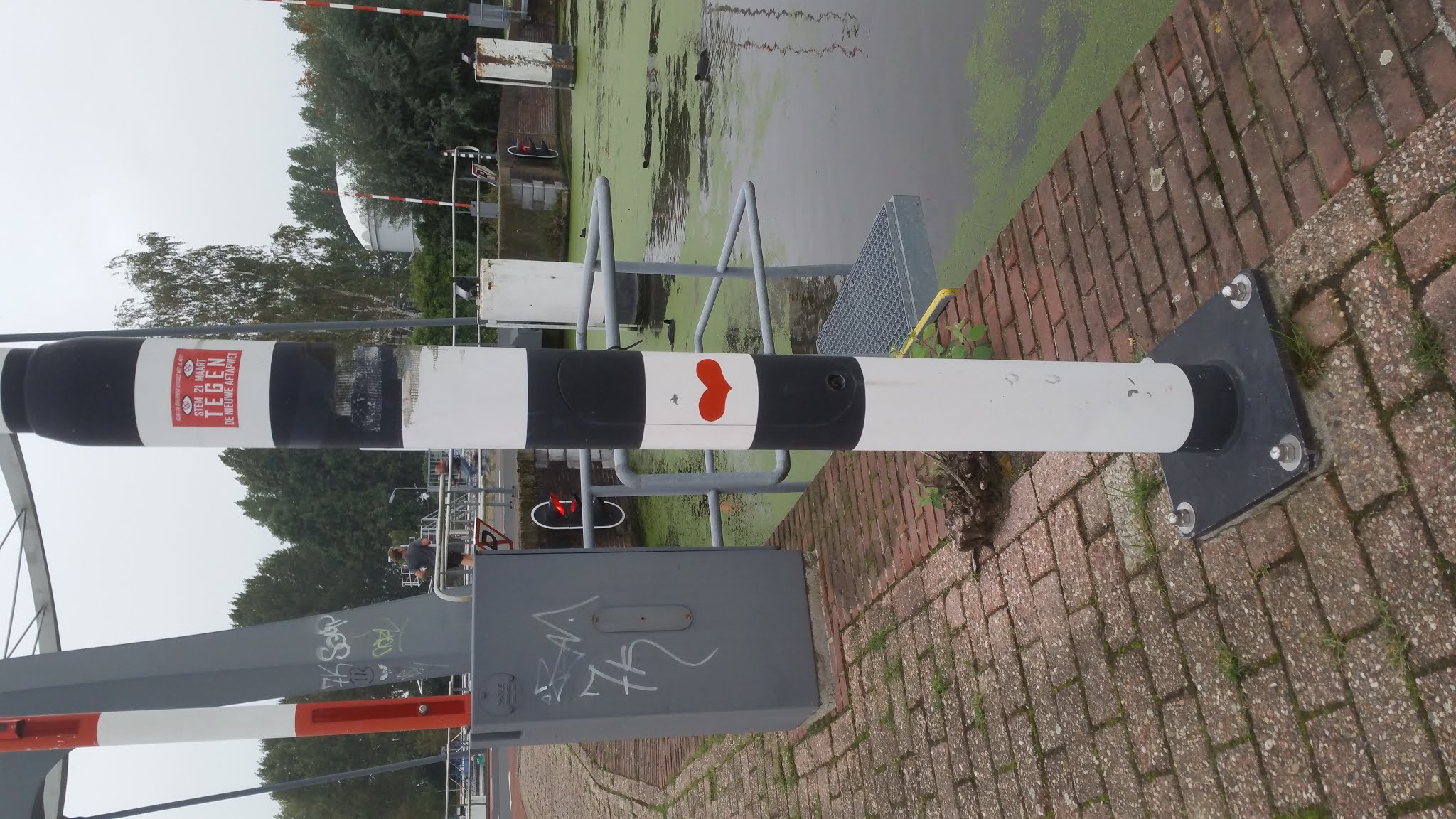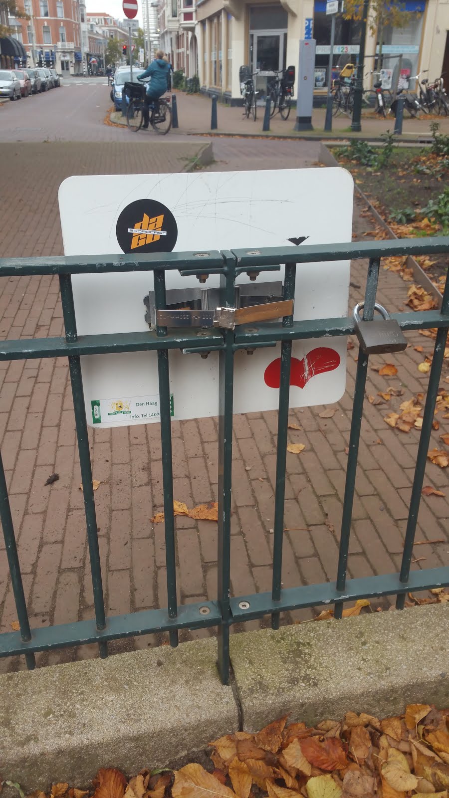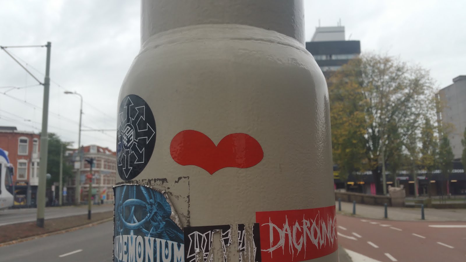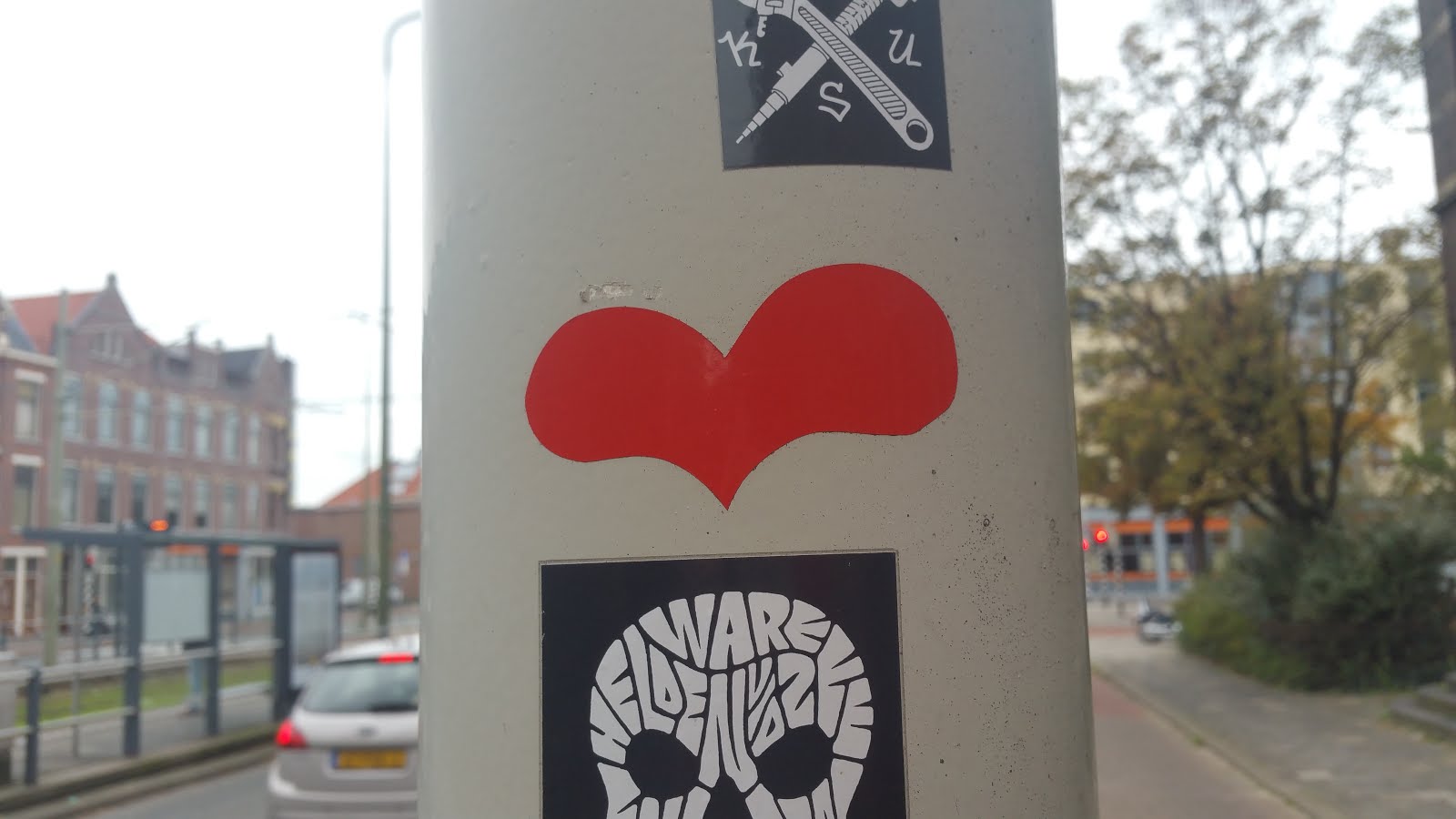 So, after a bit of research it seems that the heart had been placed on the traffic light post back in 2015, and then in 2016 the post was probably hit by a car and became slightly slanted, so today there is no heart sticker on it anymore, but it is standing straight again, so it has probably been replaced.