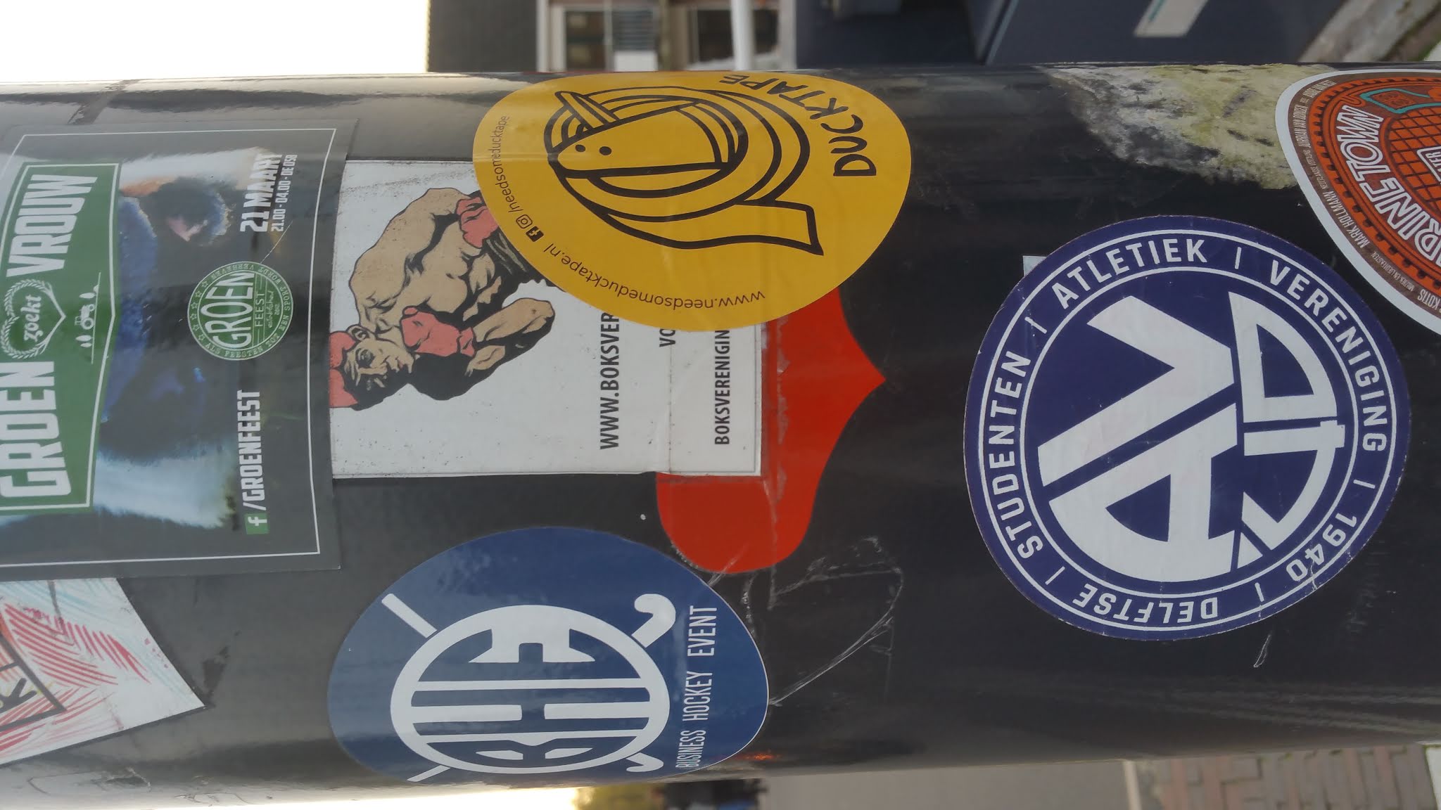 Two stickers on the same traffic sign post as the previous sticker. The previous sticker was on the west side of the post, these two used to be on the north and east sides.