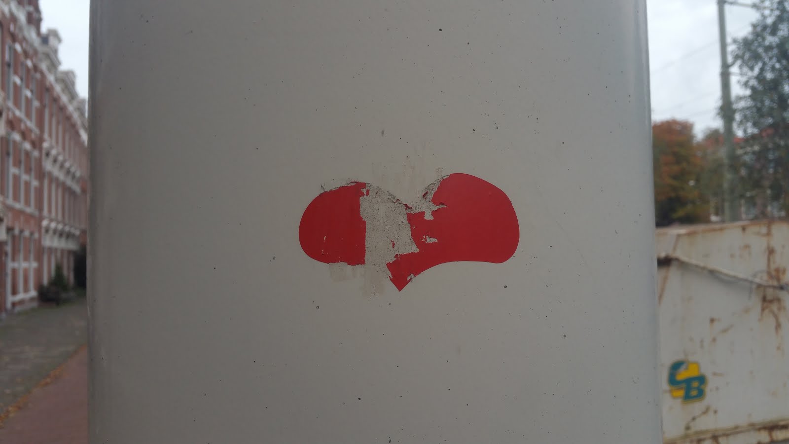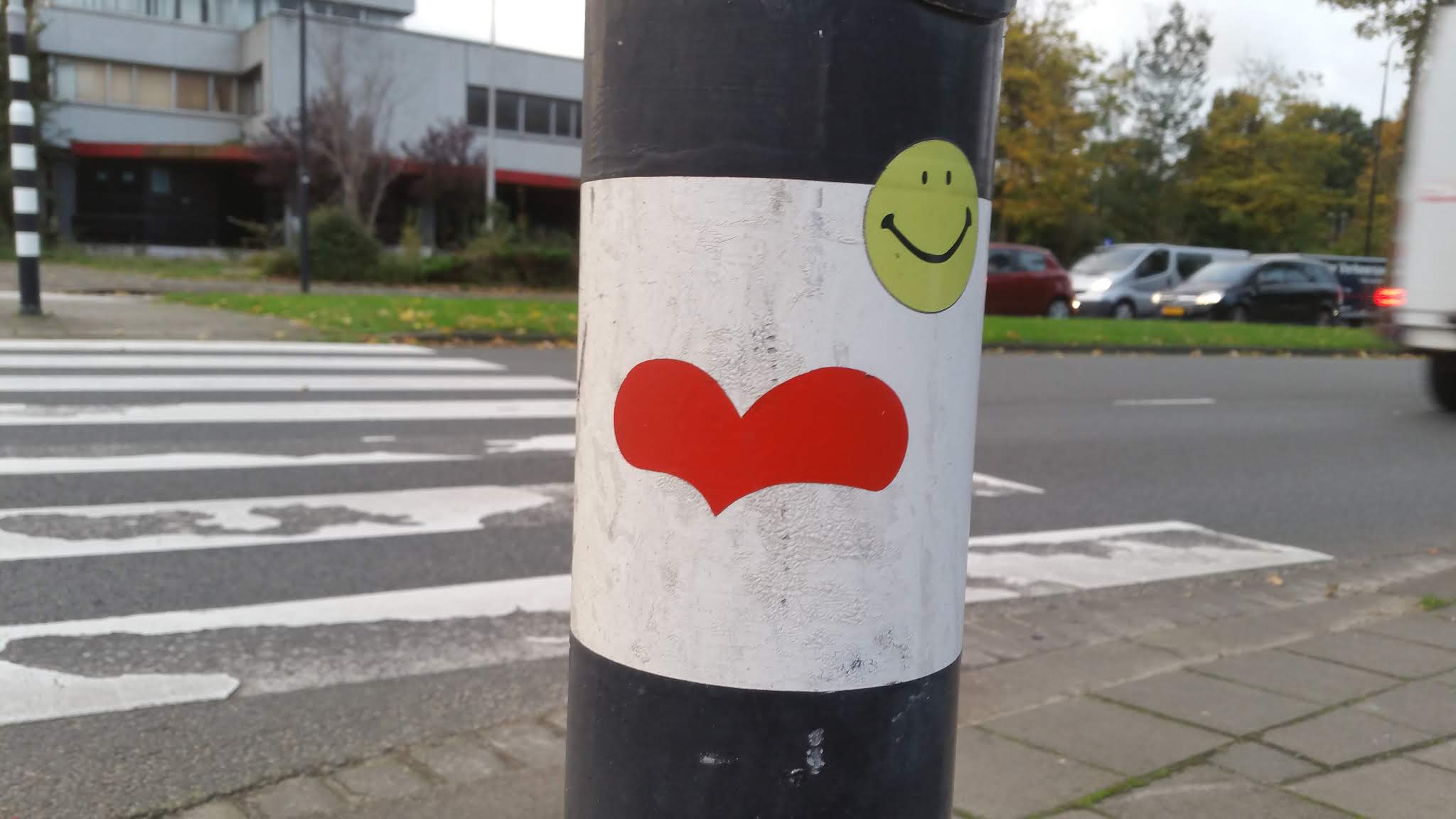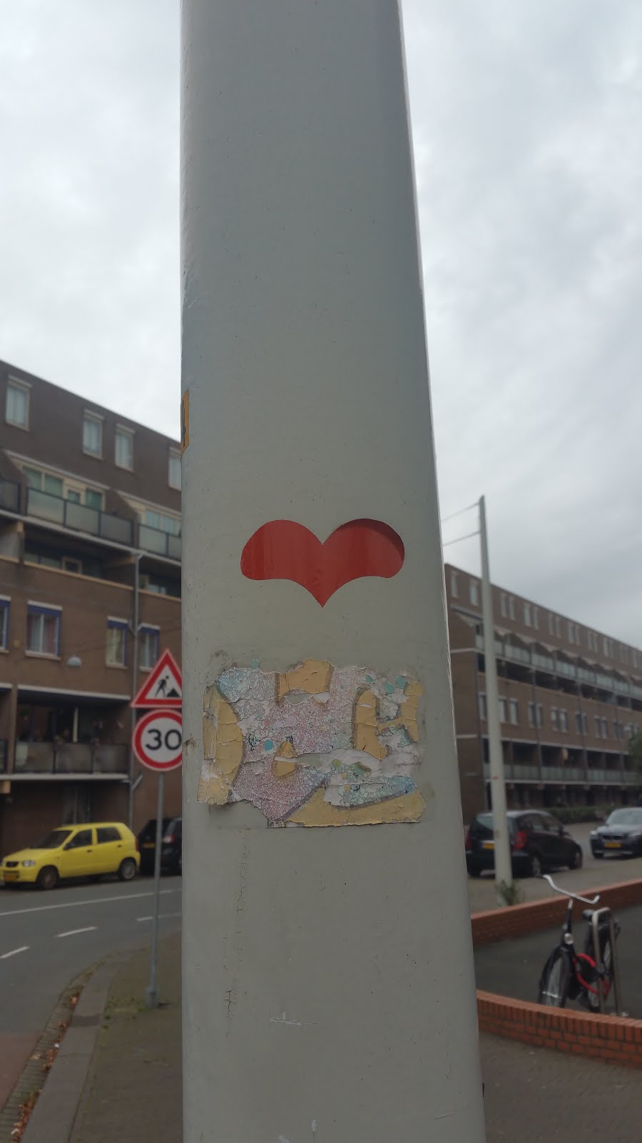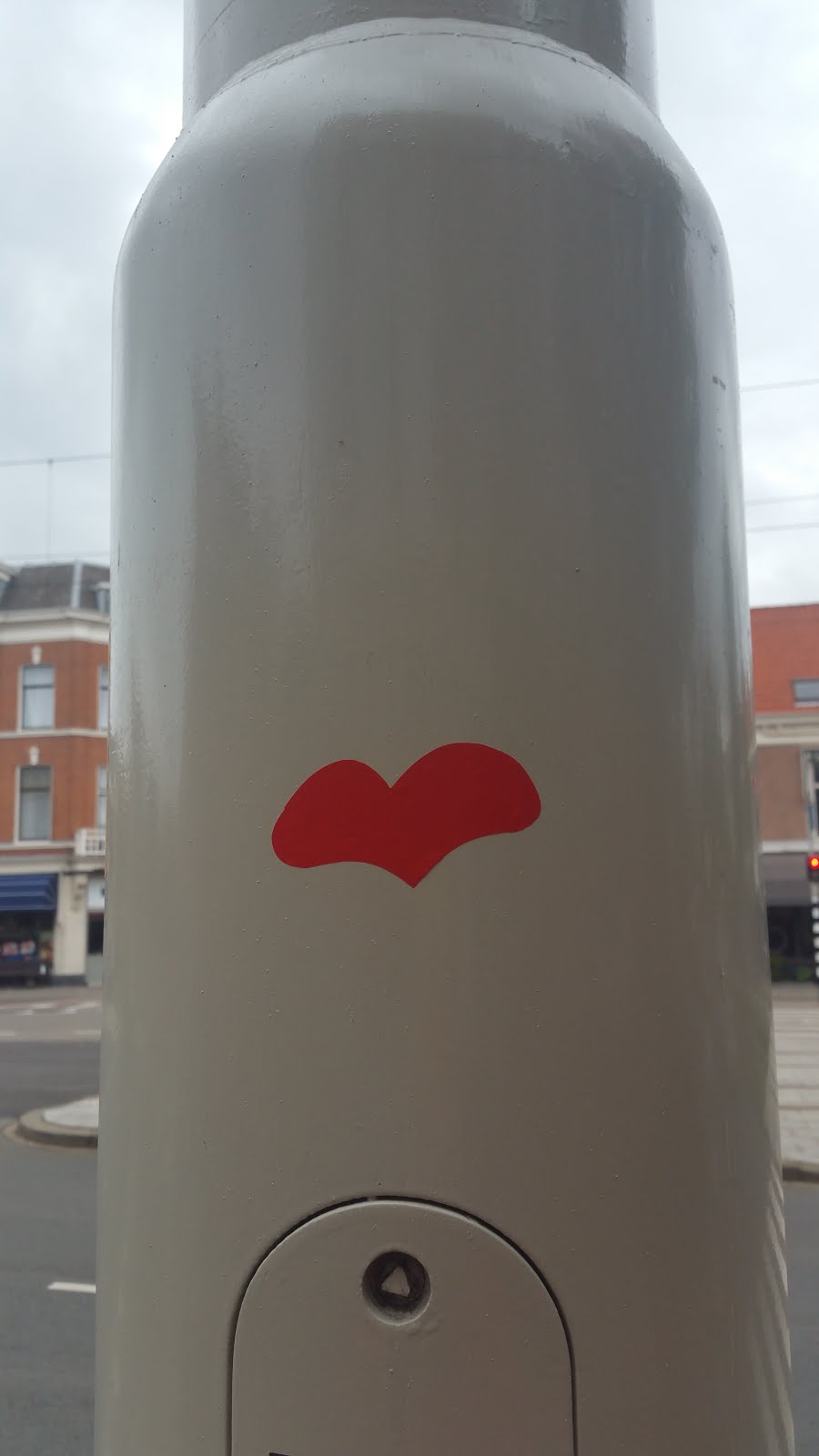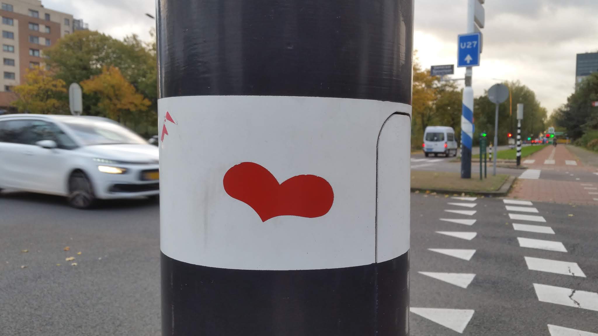This is an interesting case: while trying to locate the previous heart sticker on google street view, I could not find it, but I noticed another heart sticker on a traffic light post across the street lane. However, if that heart was there when I visited, I would have seen it.