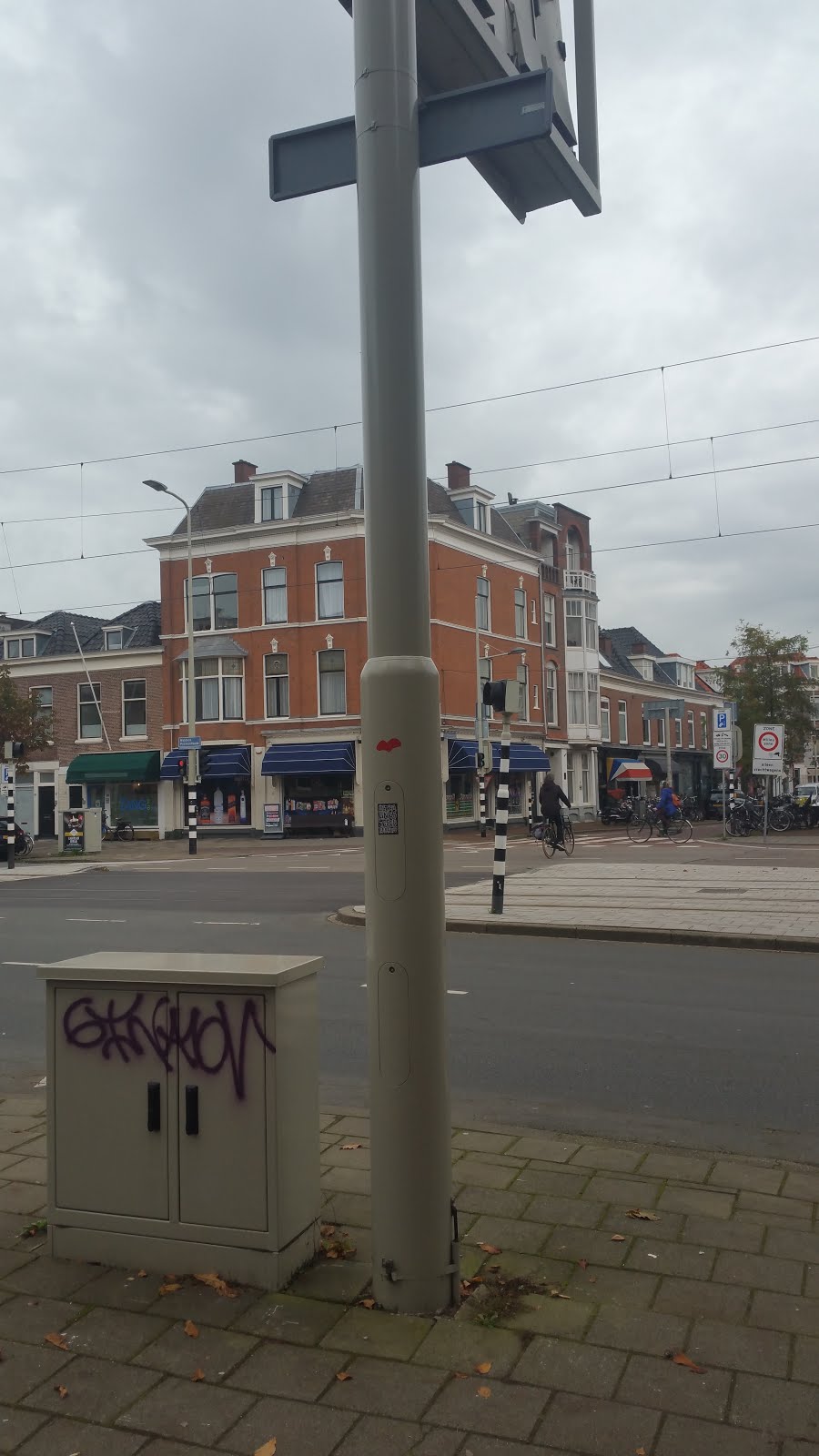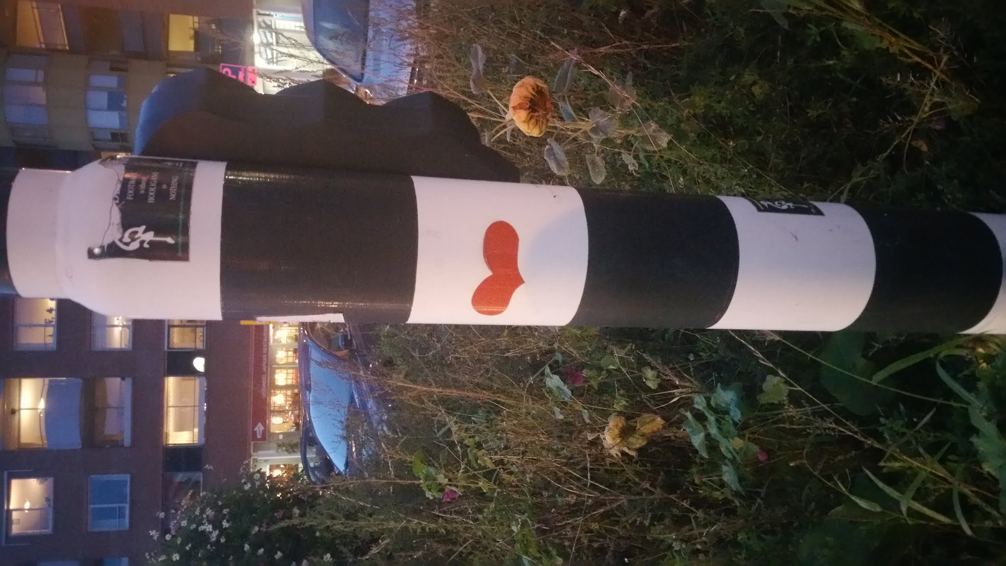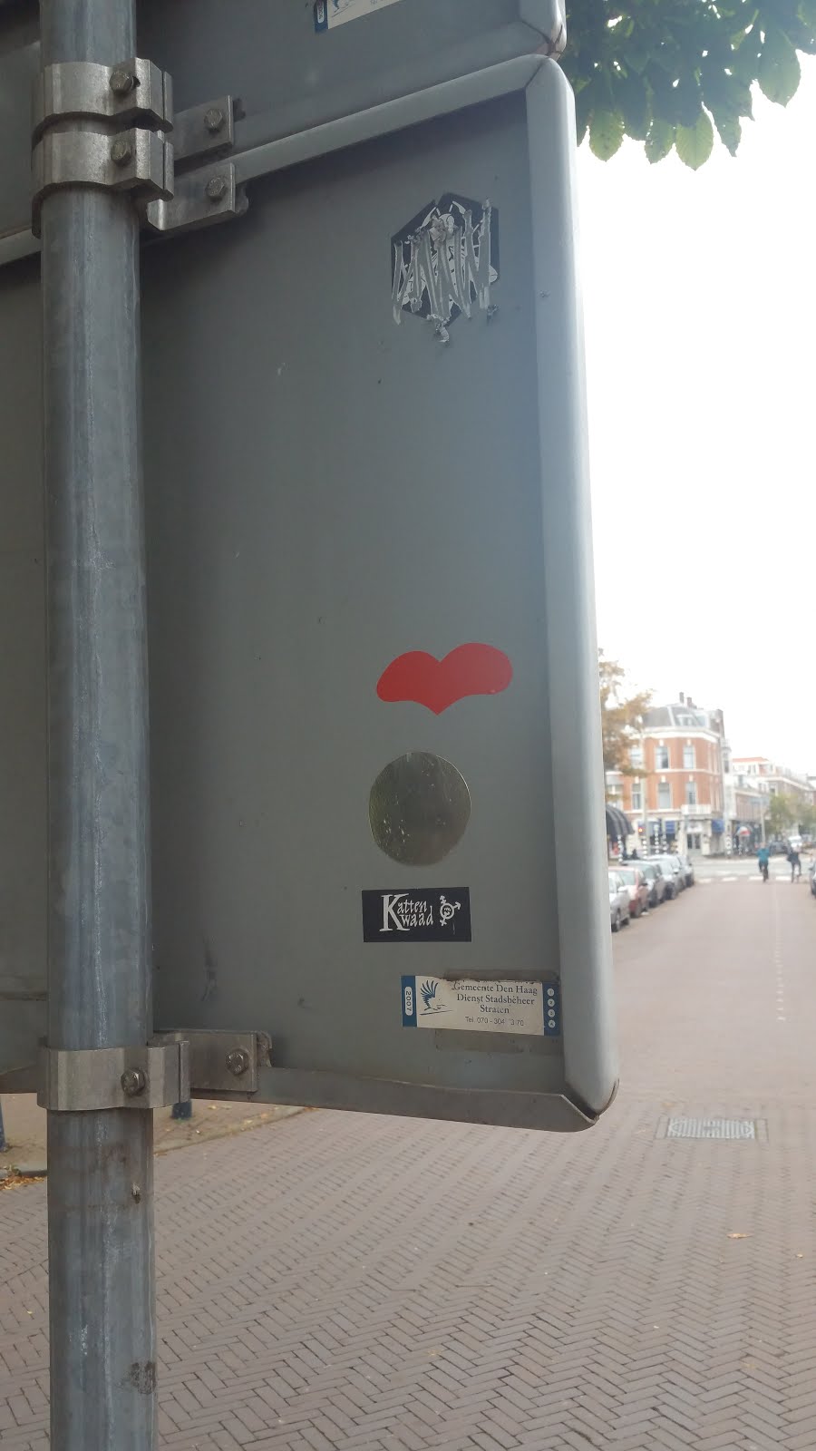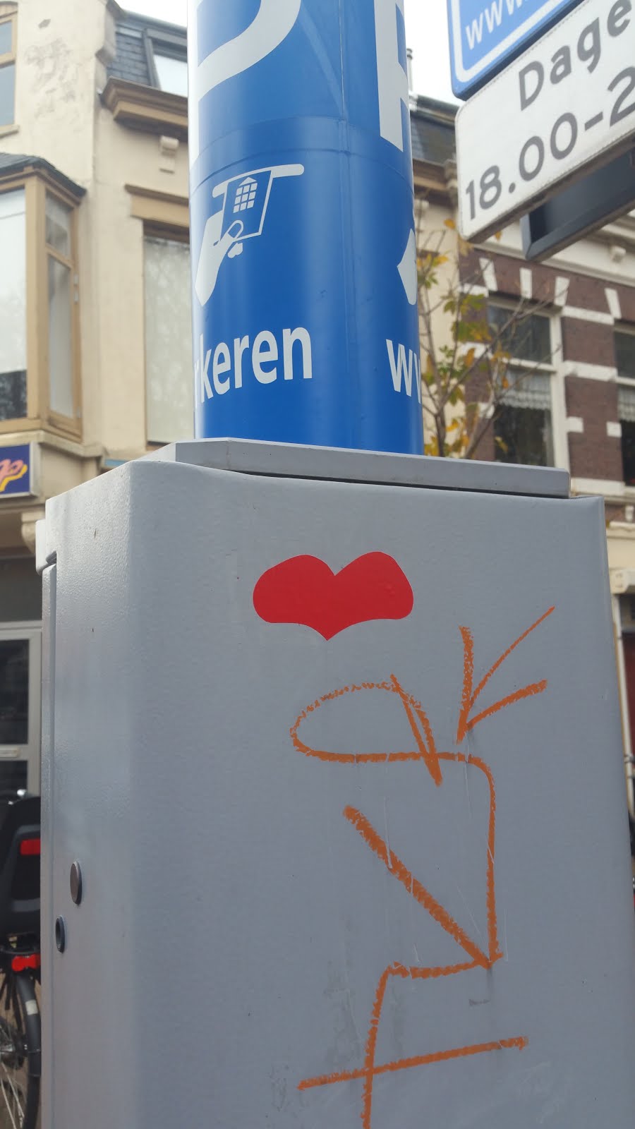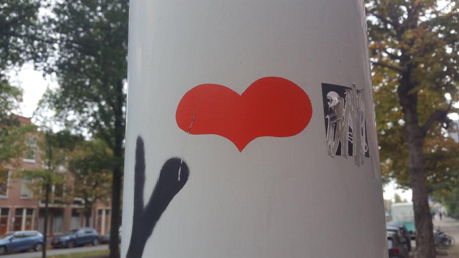 This is an interesting case: while trying to locate the previous heart sticker on google street view, I could not find it, but I noticed another heart sticker on a traffic light post across the street lane. However, if that heart was there when I visited, I would have seen it.