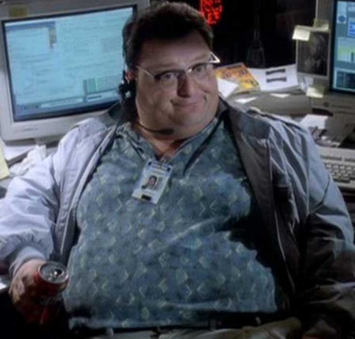 | Actor Wayne Knight in the original Jurassic Park movie playing the role of the unscrupulous programmer Dennis Nedry, (anagram of “Nerdy”,) the main villain. |