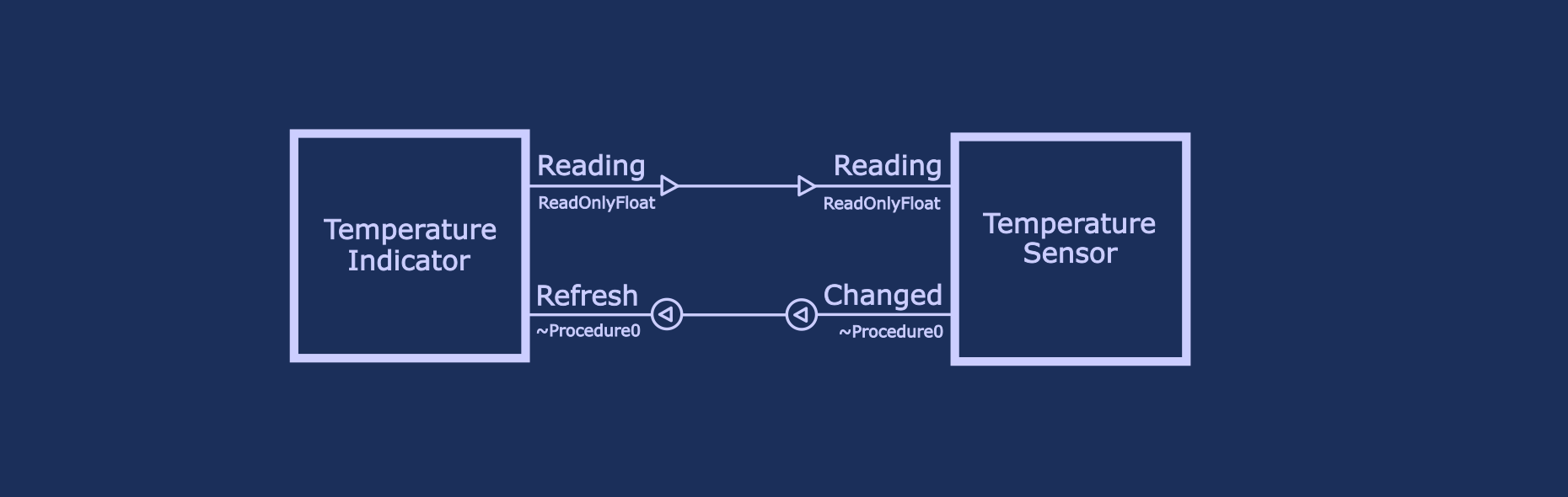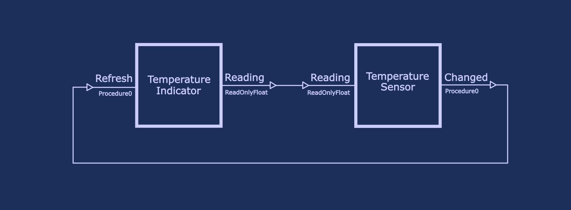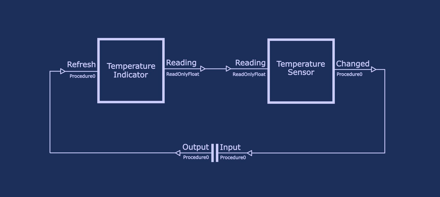 In the diagram, the Reading output of the indicator has been connected to the Reading input of the sensor, and the Changed output of the sensor has been connected to the Refresh input of the indicator. Note that this design has a call cycle in it: The indicator invokes the sensor to obtain the current temperature, but the sensor also invokes the indicator to tell it that the current temperature has changed.