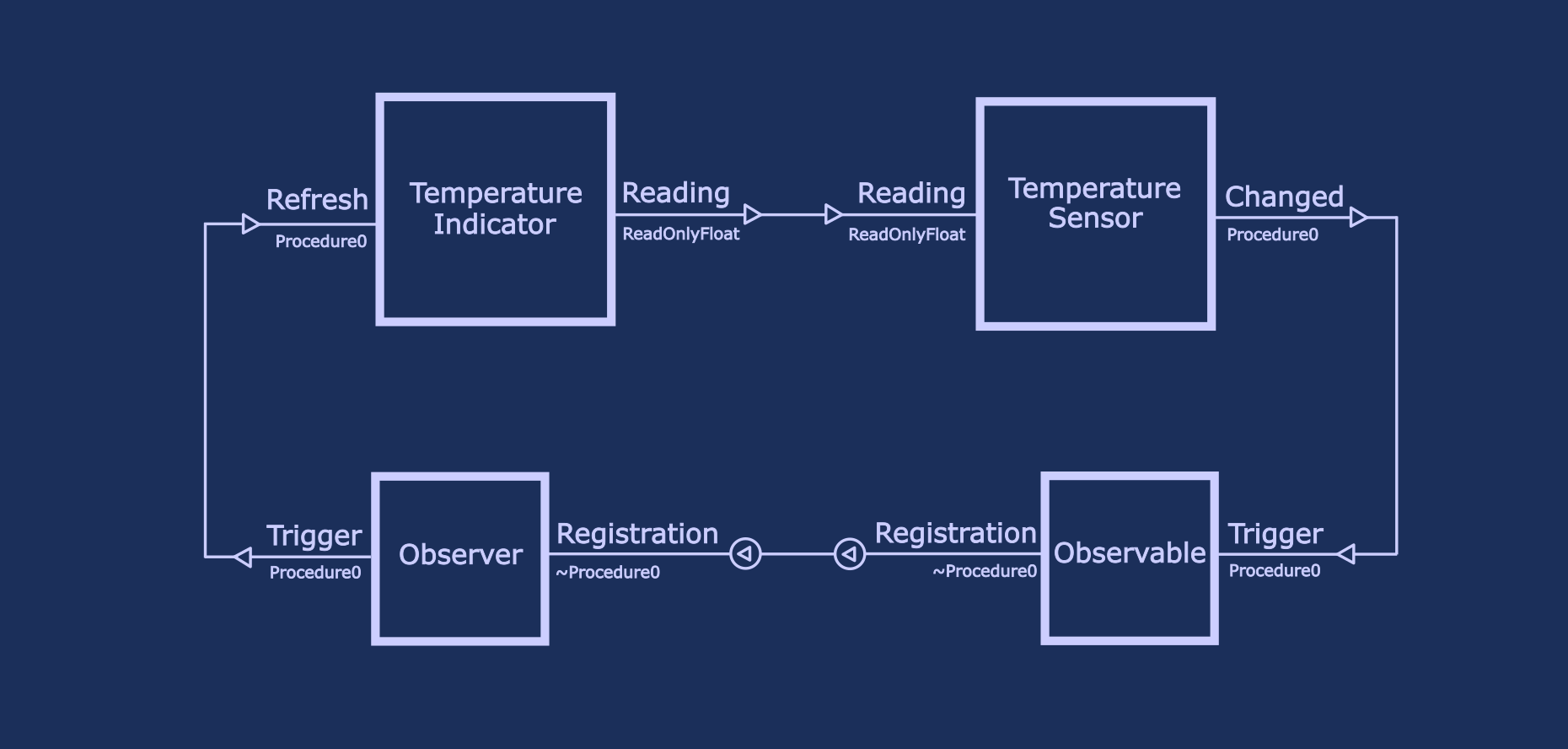 To solve this problem, let us revisit our first design, where we had a temperature sensor with a simple Changed output and a temperature indicator with a simple Refresh input, and hence a call cycle. Let us us now introduce two new components into the design, where one is a General-Purpose Observable and the other is a General-Purpose Observer.