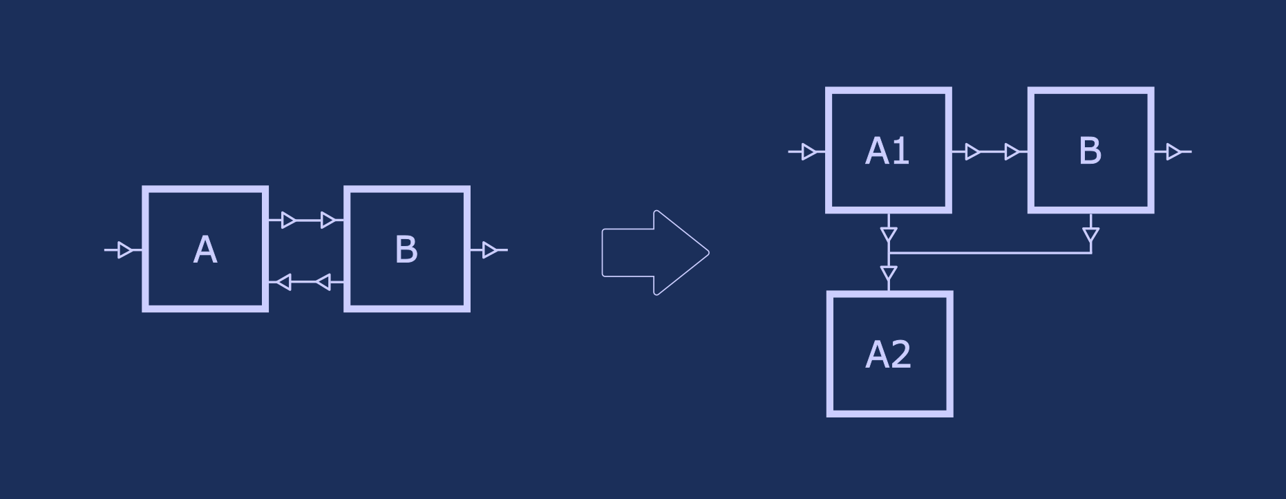 The presence of a call cycle between components A and B might indicate that at least one of the two components violates the Single Responsibility Principle (SRP). In this case, one of the responsibilities can be extracted into a separate component which only exposes inputs, thus breaking the cycle, as the following figure illustrates: