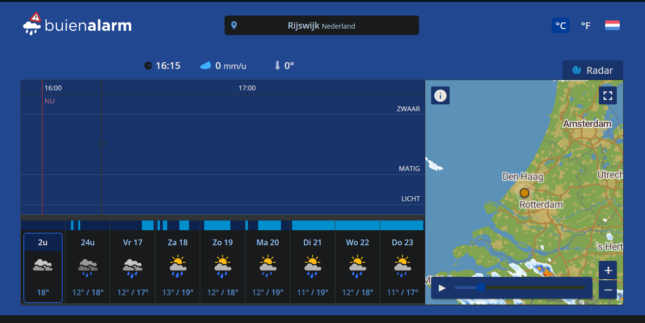 When I checked again around 16:00, buienradar was showing more or less the same thing, while buienalarm had completely changed its mind!